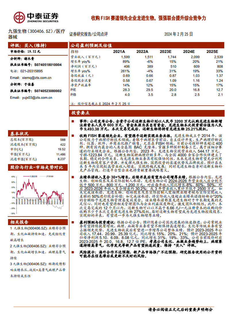 九强生物通过子公司迈新生物对FISH赛道领先企业龙进生物的战略投资,旨在通过强强联合提升在病理诊断领域的综合竞争力。此次收购预计将带来显著的业务协同效应,利用九强生物的渠道和客户资源推动龙进生物实现高速增长,并有明确的业绩承诺作为保障。未来迈新生物有望增持龙进生物至控股地位,进一步增厚九强生物的整体业绩。尽管存在市场推广和合作不及预期的风险,但基于公司在生化、血凝、病理等业务的良好发展态势和新产品的放量潜力,公司整体业绩预计将持续增长,维持“买入”评级。