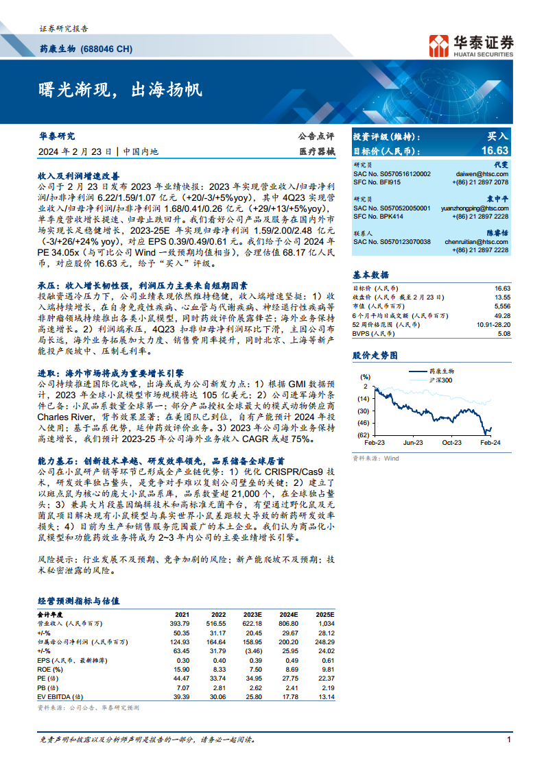 药康生物在2023年展现出营收增长的韧性,尤其在第四季度归母净利润止跌回升,预示着业绩曙光渐现。公司积极推进国际化战略,将海外市场视为未来重要的增长引擎,并凭借其卓越的创新技术和全球领先的品系储备,构建了坚实的竞争壁垒。华泰研究维持“买入”评级,并基于对公司未来稳健增长的预期,给出了16.63元的目标价。