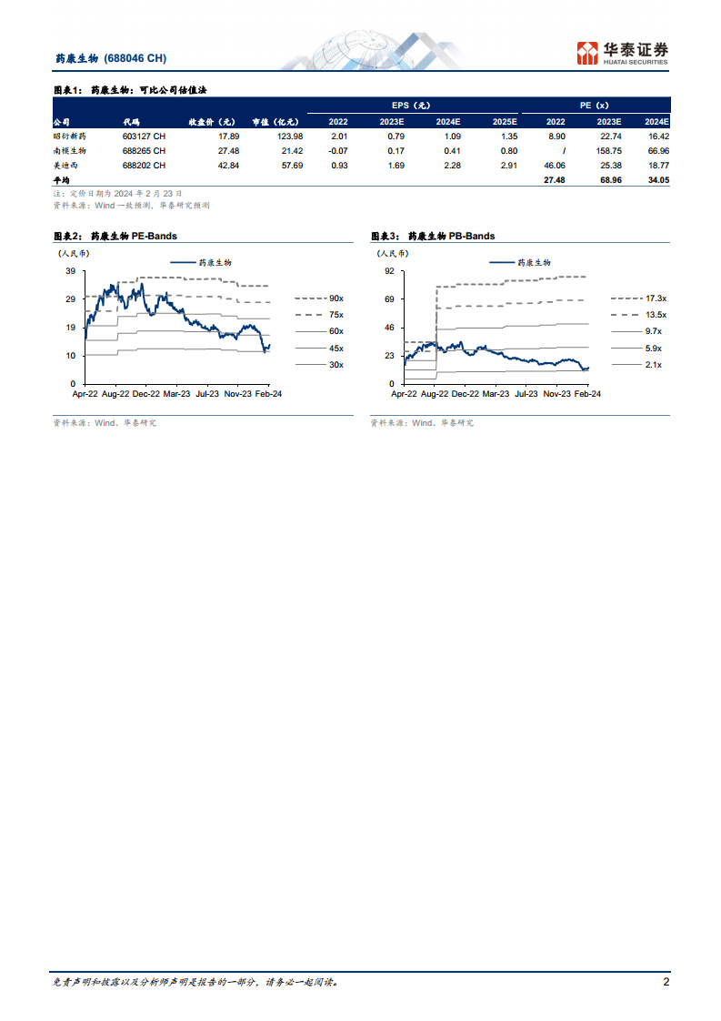 根据公司2023年业绩快报,药康生物全年实现营业收入6.22亿元,同比增长20%;归母净利润1.59亿元,同比下降3%;扣非净利润1.07亿元,同比增长5%。其中,2023年第四季度表现亮眼,实现营业收入1.68亿元,同比增长29%;归母净利润0.41亿元,同比增长13%;扣非净利润0.26亿元,同比增长5%。营收增长提速,归母净利润止跌回升。华泰研究预计公司2023-2025年归母净利润分别为1.59亿元、2.00亿元和2.48亿元,同比增速分别为-3%、26%和24%,对应EPS分别为0.39元、0.49元和0.61元。基于2024年34.05倍的PE(与可比公司Wind一致预期均值相当),公司合理估值68.17亿元人民币,对应目标股价16.63元。