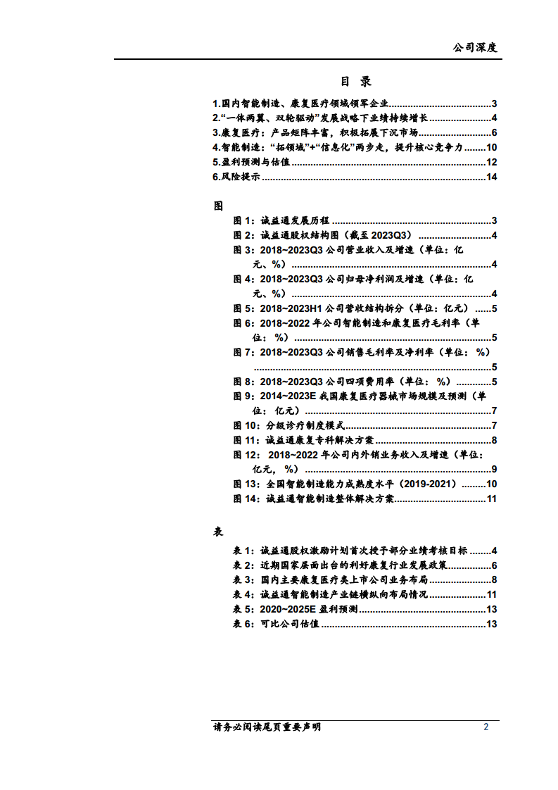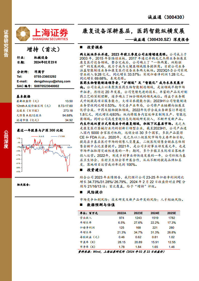 在智能制造领域,诚益通凭借近20年的深耕,已成为医药生物智能制造的领导者,并通过“扩领域”和“智能化”战略不断提升核心竞争力,横向拓展至化学合成、中药及植物提取,纵向延伸至制剂生产和智能包装,同时高度重视信息化产品研发。康复医疗设备业务方面,公司旗下龙之杰作为行业创新引领者,通过丰富的产品矩阵和“深耕三级医院+聚焦基层市场”的策略,积极响应国家分级诊疗和健康老龄化政策,成功拓展县乡基层市场并实现外销业务的厚积薄发。展望未来,公司两大业务板块均有望保持稳健增长,预计2023-2025年归母净利润将持续增长,对应PE估值具有吸引力,首次覆盖给予“增持”评级。
