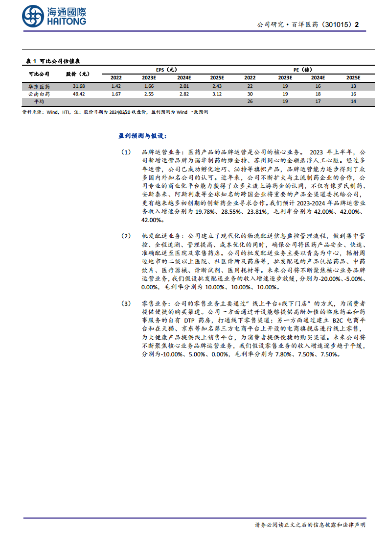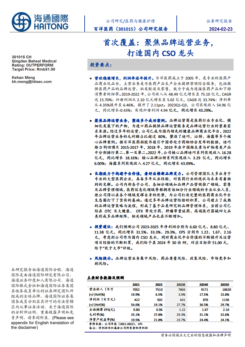 本报告核心观点指出,百洋医药作为专业的医药产品商业化平台,正逐步巩固其在国内CSO(合同销售组织)领域的龙头地位。公司通过聚焦品牌运营业务,成功孵化并运营多个核心品牌,实现了营收的稳健增长和利润率的持续提升。