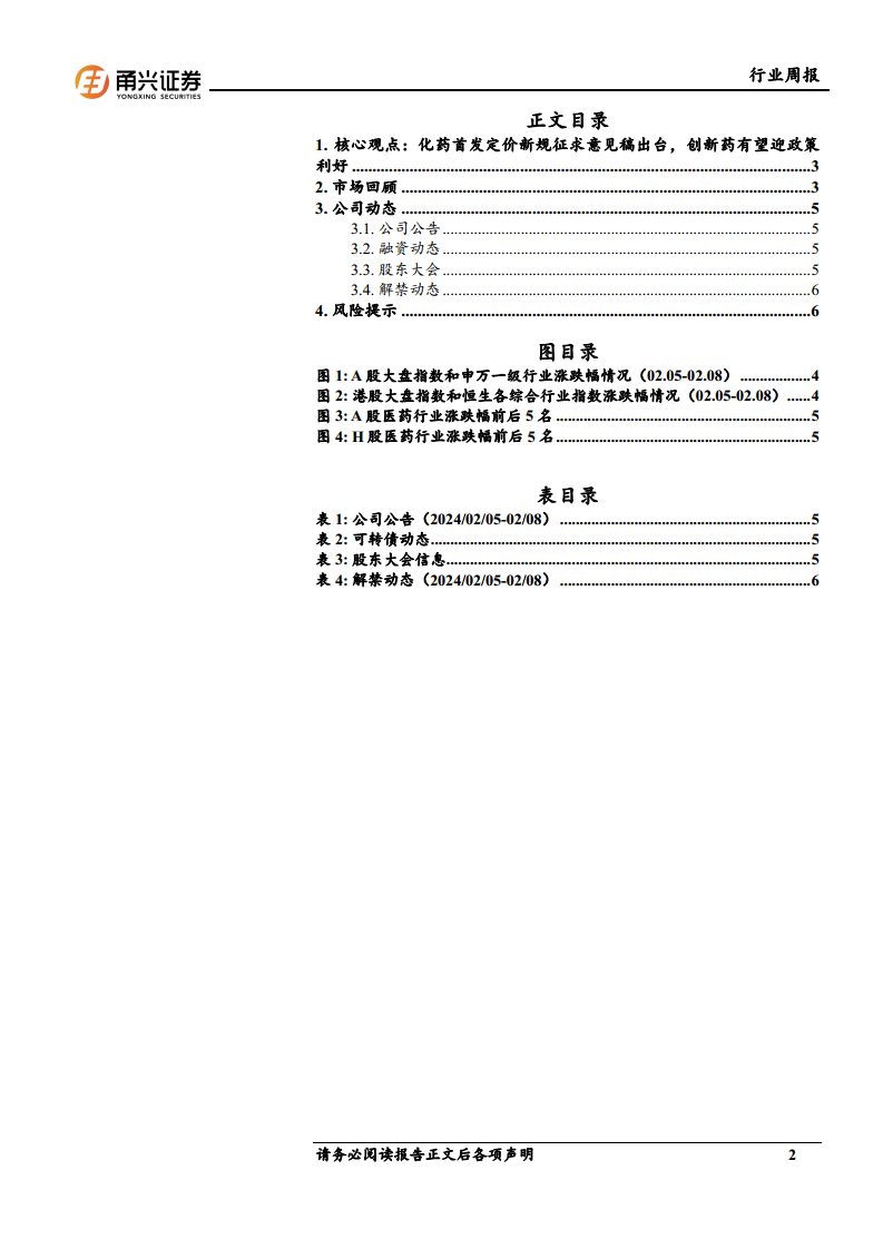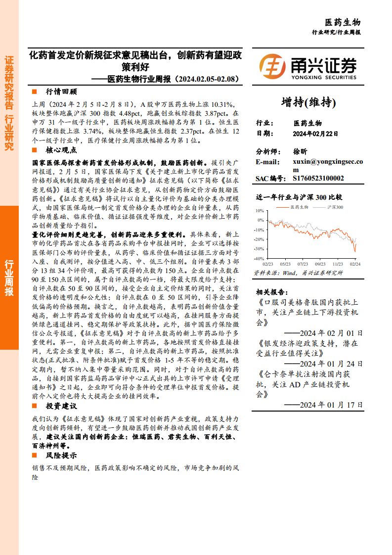 医药生物行业周报(2024.02.05-02.08):化药首发定价新规征求意见稿出台,创新药有望迎政策利好