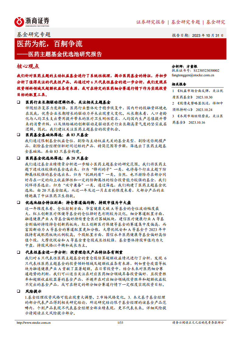 医药主题基金优选池研究报告:医药为舵,百舸争流