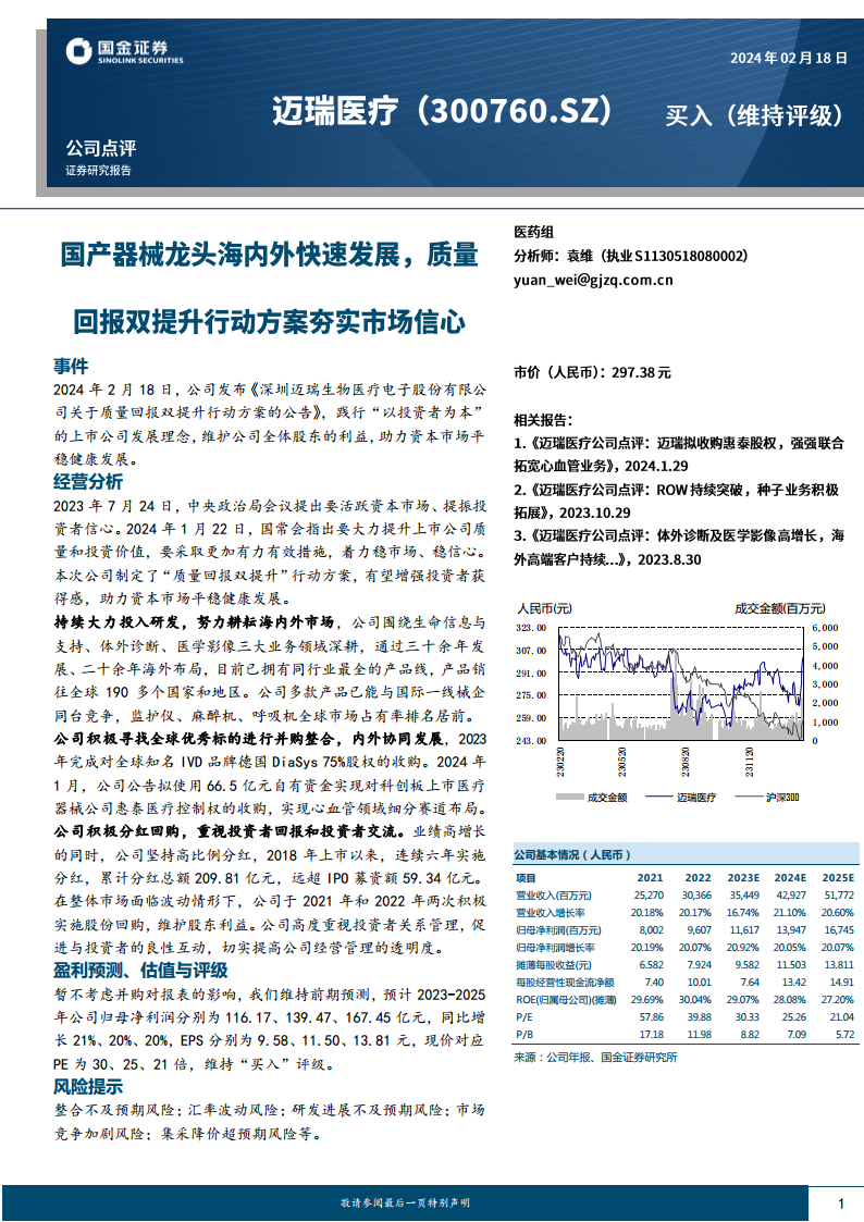 迈瑞医疗(300760):国产器械龙头海内外快速发展,质量回报双提升行动方案夯实市场信心