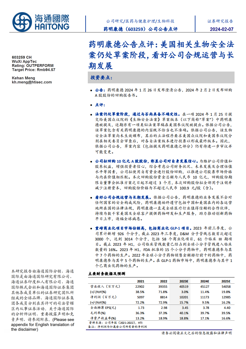 报告对药明康德的合规运营和长期发展持乐观态度。公司持续为数千家美国及全球客户提供药物研发和生产服务,助力推动创新药物早日上市,造福全球病患。其在全球医疗行业中作为值得信赖的合作伙伴的地位,以及对法律法规的严格遵守,是其长期发展的重要基石。
