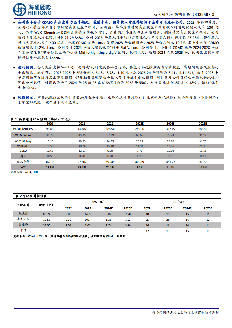 药明康德在小分子CDMO产业中具备全球领先的竞争力。公司预计2023年第四季度非特定商业化生产项目收入将首次突破人民币100亿元,其中WuXi Chemistry D&M业务将保持强劲增长,并在前三季度基础上加速增长。剔除特定商业化生产项目后,公司第四季度收入增长预计将达到29-34%,2023年全年收入增长预计为25-26%,整体收入将首次突破人民币400亿元。与全球CDMO龙头Lonza相比,Lonza预计2024年收入增长保持“持平”,小分子CDMO板块2024-2028年收入复合增速在“中个位数至高个位数”区间。报告认为,展望2024年和2025年,药明康德的收入增速仍将快于全球龙头Lonza。
