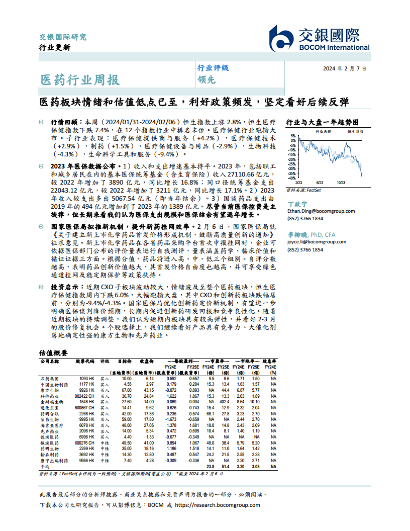 本周(2024/01/31-2024/02/06)恒生指数上涨2.8%,而恒生医疗保健指数下跌7.4%,在12个指数行业中排名末位,显著跑输大市。子行业表现分化,医疗保健提供商与服务(+4.2%)、医疗保健技术(+2.9%)和制药(+1.5%)录得上涨,而医疗保健设备与用品(-2.9%)、生物科技(-4.3%)和生命科学工具和服务(-9.4%)则出现下跌。个股方面,开拓药业-B(+43.4%)、康方生物(+8.6%)和上海医药(+8.3%)涨幅居前,而药明合联(-20.7%)、药明生物(-18.7%)和药明康德(-13.0%)跌幅较大。