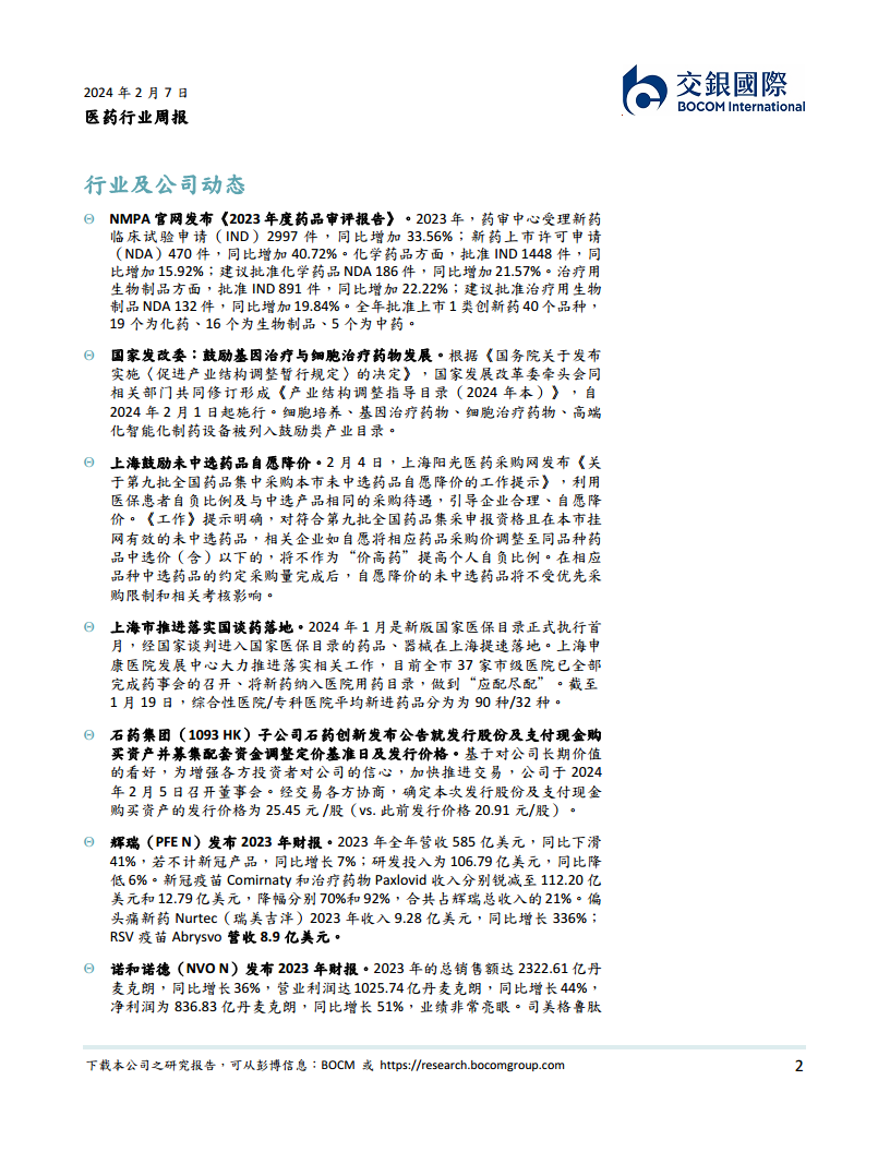行业动态方面,2023年国家药监局药审中心受理新药临床试验申请(IND)2997件,同比增长33.56%;新药上市许可申请(NDA)470件,同比增长40.72%。全年批准上市1类创新药40个品种。国家发改委将细胞培养、基因治疗药物、细胞治疗药物等列入鼓励类产业目录。上海市积极推进国谈药落地,鼓励未中选药品自愿降价,并加速新药纳入医院用药目录。