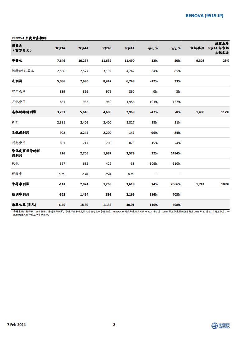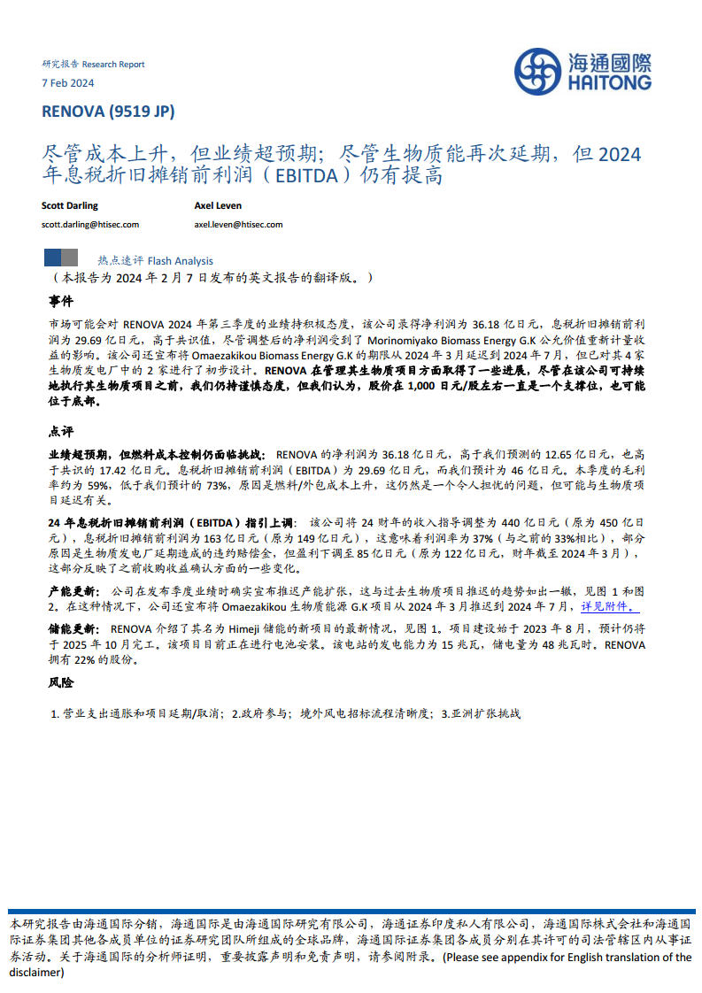 RENOVA第三季度净利润为36.18亿日元,远高于海通国际预测的12.65亿日元和市场共识的17.42亿日元。EBITDA为29.69亿日元,低于海通国际预测的46亿日元。本季度毛利率约为59%,低于海通国际预计的73%,主要原因是燃料/外包成本上升,这仍然是一个值得关注的问题,并可能与生物质项目延迟有关。