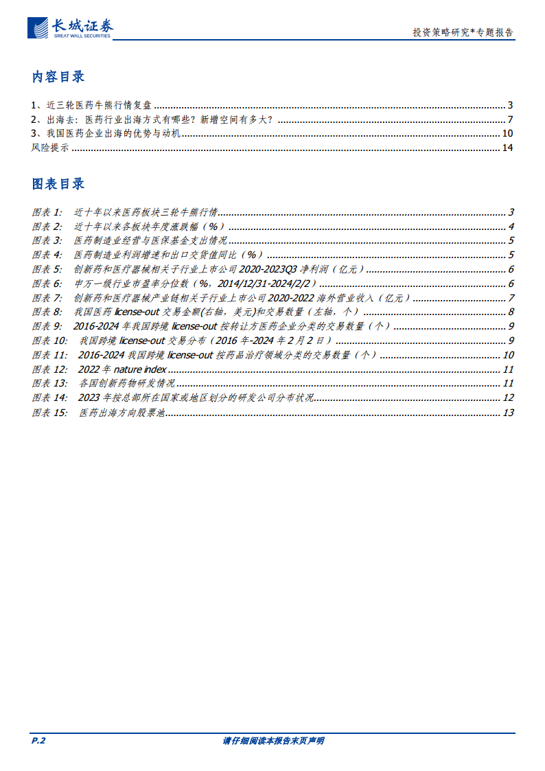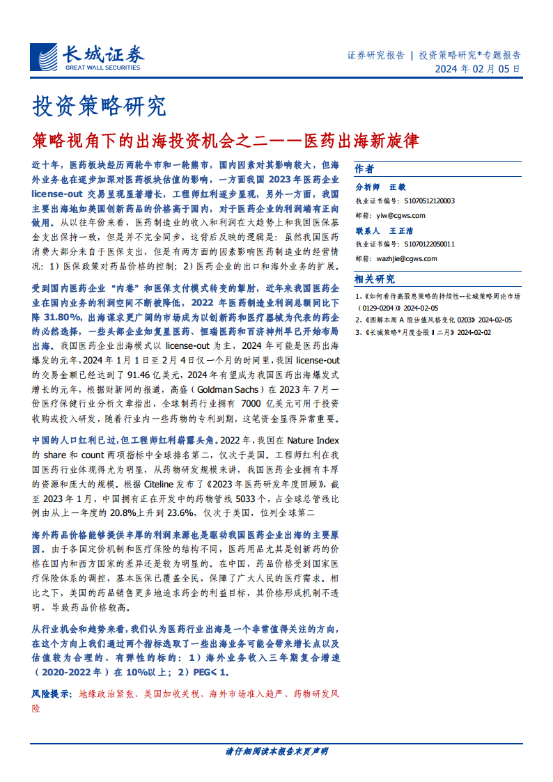 本报告深入分析了中国医药行业在策略视角下的出海投资机会。面对国内医保控费和市场竞争加剧的压力,医药企业出海已成为寻求新增长和利润空间的必然选择。中国凭借其强大的“工程师红利”和全球领先的药物研发规模,为出海奠定了坚实基础。同时,海外市场尤其是美国创新药的高定价,为中国药企提供了显著的利润驱动力。以License-out为主的出海模式正迎来爆发式增长,2024年有望成为中国医药出海的元年。报告通过量化指标筛选出潜在投资标的,强调了医药出海作为当前值得高度关注的投资方向。然而,投资者仍需警惕地缘政治、关税、市场准入和药物研发等潜在风险。