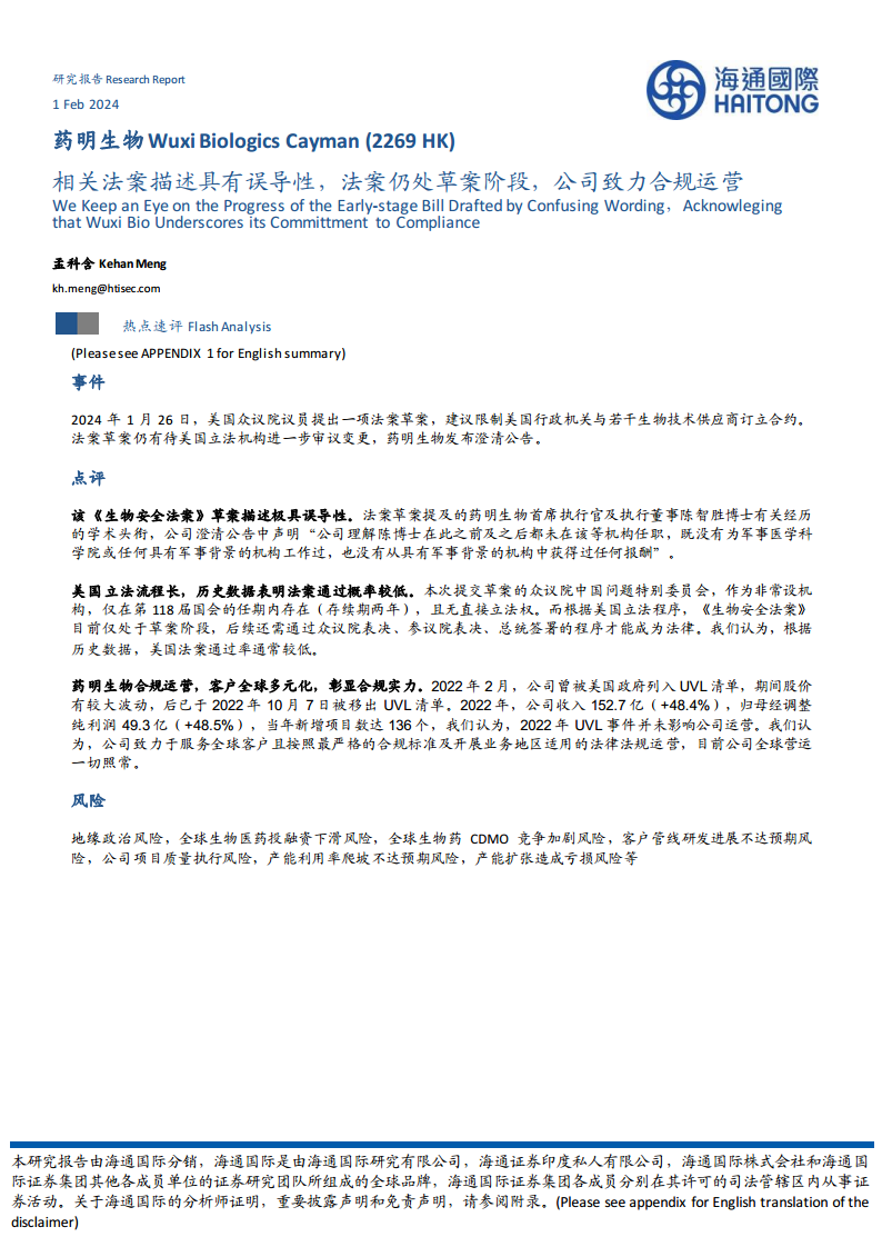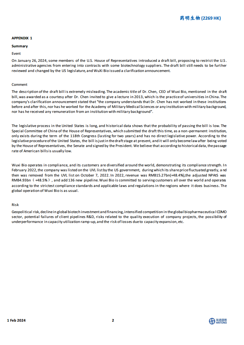 药明生物(02269):相关法案描述具有误导性,法案仍处草案阶段,公司致力合规运营