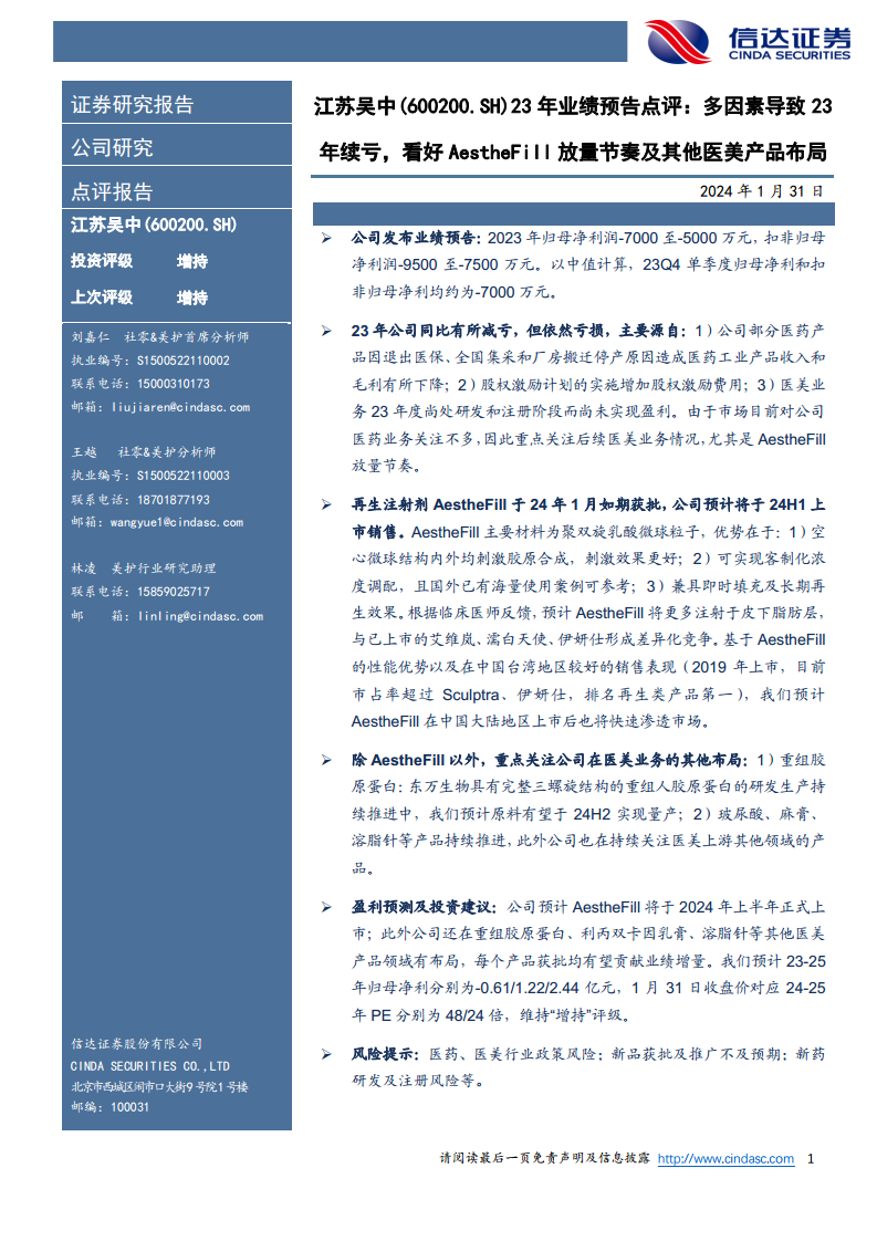 江苏吴中(600200):23年业绩预告点评:多因素导致23年续亏,看好AestheFill放量节奏及其他医美产品布局