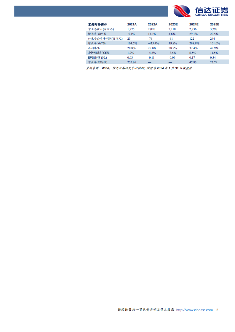 随着AestheFill预计在2024年上半年正式上市,以及重组胶原蛋白、利丙双卡因乳膏、溶脂针等其他医美产品领域的布局,每个产品获批均有望为公司贡献业绩增量。信达证券预计公司2023年归母净利润为-0.61亿元,并预测2024年将扭亏为盈,归母净利润达1.22亿元,2025年进一步增长至2.44亿元。营业总收入预计从2023年的21.18亿元增长至2024年的27.36亿元(同比增长29.1%)和2025年的32.98亿元(同比增长20.5%)。毛利率预计将从2023年的28.2%显著提升至2024年的37.4%和2025年的42.9%。基于2024年1月31日收盘价,对应2024-2025年PE分别为47.83倍和23.79倍。