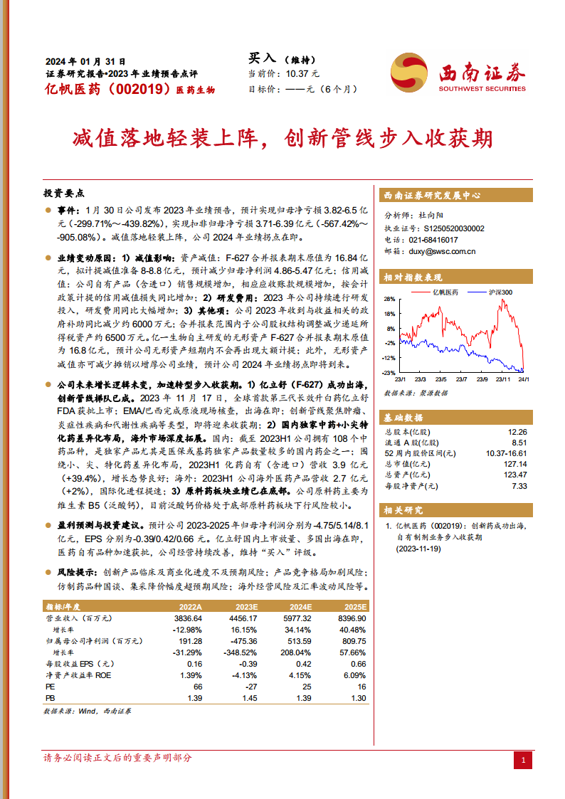 亿帆医药2023年业绩预告显示公司因F-627无形资产大额减值等因素面临短期亏损,但此次减值被视为一次性风险出清,为公司未来发展奠定基础。展望未来,随着全球首款第三代长效升白药亿立舒(F-627)成功出海并在多国加速上市,以及公司在国内独家中药和特色化药领域的差异化布局,创新管线正逐步进入收获期。分析师基于对各业务板块的积极预期,预测公司2024年业绩将实现显著扭亏为盈,并持续增长,因此维持“买入”评级。投资者需关注创新产品临床及商业化进度、市场竞争加剧、集采降价以及海外经营和汇率波动等风险。