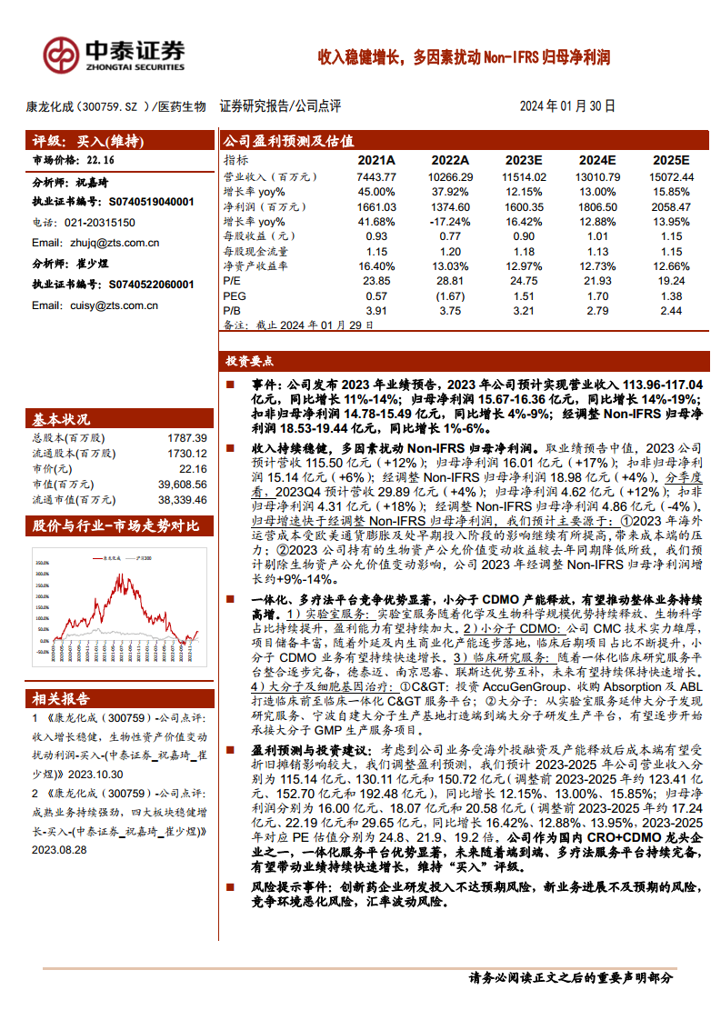 康龙化成在2023年实现了营业收入的稳健增长,但受海外运营成本和生物资产公允价值变动等因素影响,经调整Non-IFRS归母净利润增速有所放缓。公司凭借其在实验室服务、小分子CDMO、临床研究服务以及大分子及细胞基因治疗领域的一体化、多疗法平台优势,展现出强劲的长期增长潜力。尽管面临创新药研发投入、CMC业务毛利率、市场竞争和汇率波动等风险,但鉴于其作为CRO+CDMO行业龙头地位和完善的服务平台,分析师维持“买入”评级,并预计未来业绩将持续快速增长。