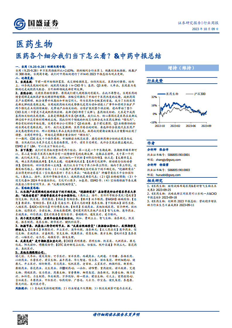 报告强调,医药板块整体正处于一个中长期底部,具备良好的长期胜率和赔率。预计9月至10月将迎来一波情绪修复的底部反弹行情,目前正处于“热点主题创造赚钱效应”和“底部变化演绎,驱动填仓位轮动普涨”的阶段。在策略配置上,建议投资者从多个维度进行布局:一是关注具有长期产业逻辑确定性的领域,如“挖掘新需求”的大单品(典型代表为减肥药)和“破局老需求”的肿瘤等技术平台及国际化方向;二是寻找Q3业绩超预期的个股;三是关注个股变化叠加2024年估值性价比的机会,如基药目录进展和ESMO大会催化;四是把握“反腐后院端修复”的最佳时间节点;五是配置具有“反腐免疫”属性的CXO和OTC板块。此外,中药板块在2023年上半年表现出亮眼的营收和利润增速,景气度持续回升,盈利能力和经营效率均有所优化,其底部机会和政策利好值得重点关注。