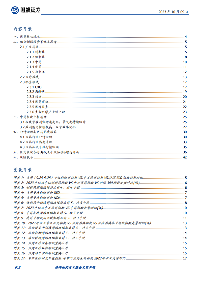 本报告核心观点指出,在2023年9月25日至9月28日当周,申万医药指数环比上涨2.63%,位列全行业涨跌幅榜首,显著跑赢创业板指数和沪深300指数,显示出医药板块的强势反弹。此次反弹主要由结构性热点驱动,其中减肥药及其配套产业链(如CXO)、基药、Q3业绩超预期个股以及大单品主线表现尤为亮眼。减肥药因其顺畅的产业逻辑、契合消费升级的属性和巨大的市场空间,成为本轮医药底部反弹中最受瞩目的主线。