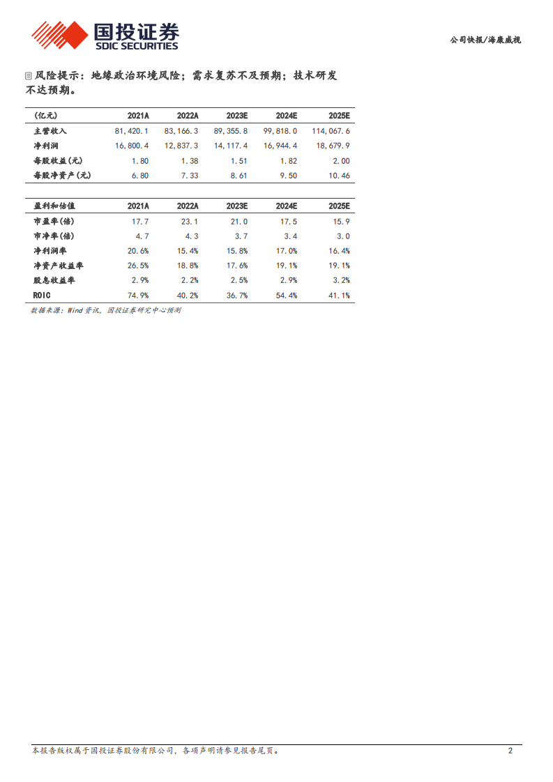 财务预测显示,公司在2024年和2025年有望继续保持良好的增长势头,盈利能力和投资回报率预计将持续提升,同时财务结构保持稳健,偿债能力充足。尽管面临地缘政治、需求复苏不及预期和技术研发等风险,但作为行业龙头,海康威视有望率先受益于行业景气度回升。基于对公司未来业绩的乐观预期和估值修复空间,报告维持“买入-A”的投资评级,并设定了具有吸引力的6个月目标价。