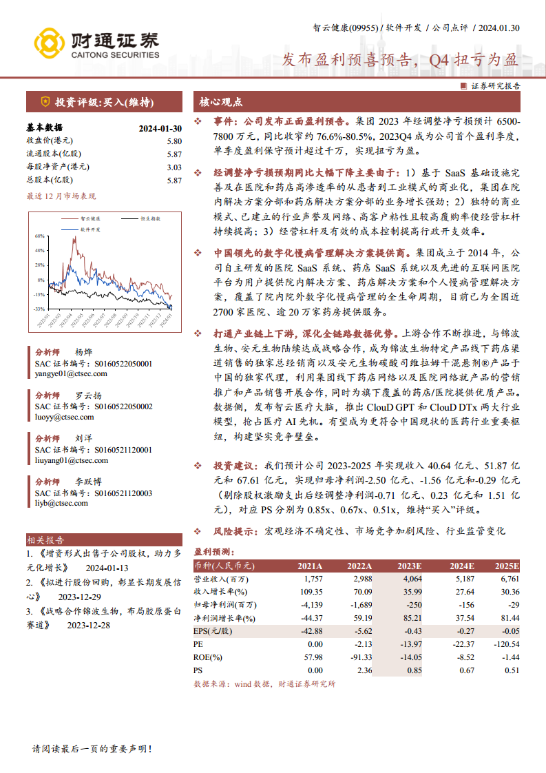 智云健康在2023年取得了经营上的重大突破,第四季度首次实现盈利,全年经调整净亏损大幅收窄,充分展现了其数字化慢病管理解决方案的强大商业化潜力。公司通过持续完善SaaS基础设施、深化“从患者到工业”模式,以及有效控制成本,显著提升了经营效率和盈利能力。同时,智云健康积极整合产业链上下游资源,并前瞻性地布局医疗AI领域,通过“智云医疗大脑”及ClouD GPT、ClouD DTx等创新产品,构建了坚实的竞争壁垒。尽管面临宏观经济、市场竞争和监管变化等潜在风险,但鉴于其稳健的营收增长预期和持续改善的盈利能力,分析师维持“买入”评级,认为公司有望成为中国医药行业的重要枢纽,具备长期投资价值。