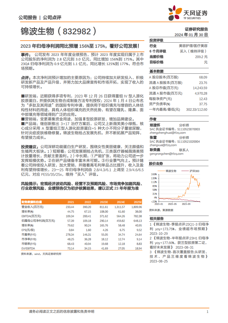 锦波生物(832982):2023年归母净利润同比预增156%至175%,看好公司发展