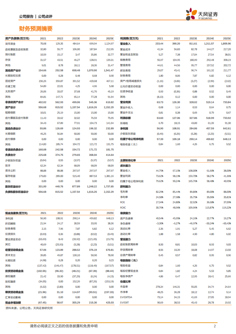 公司预计在2023-2025年保持高速增长,营业收入年均增长率预计分别为108.00%、61.60%、38.00%,归母净利润年均增长率预计分别为165.76%、58.48%、40.95%。毛利率预计维持在88%-89%的高水平。