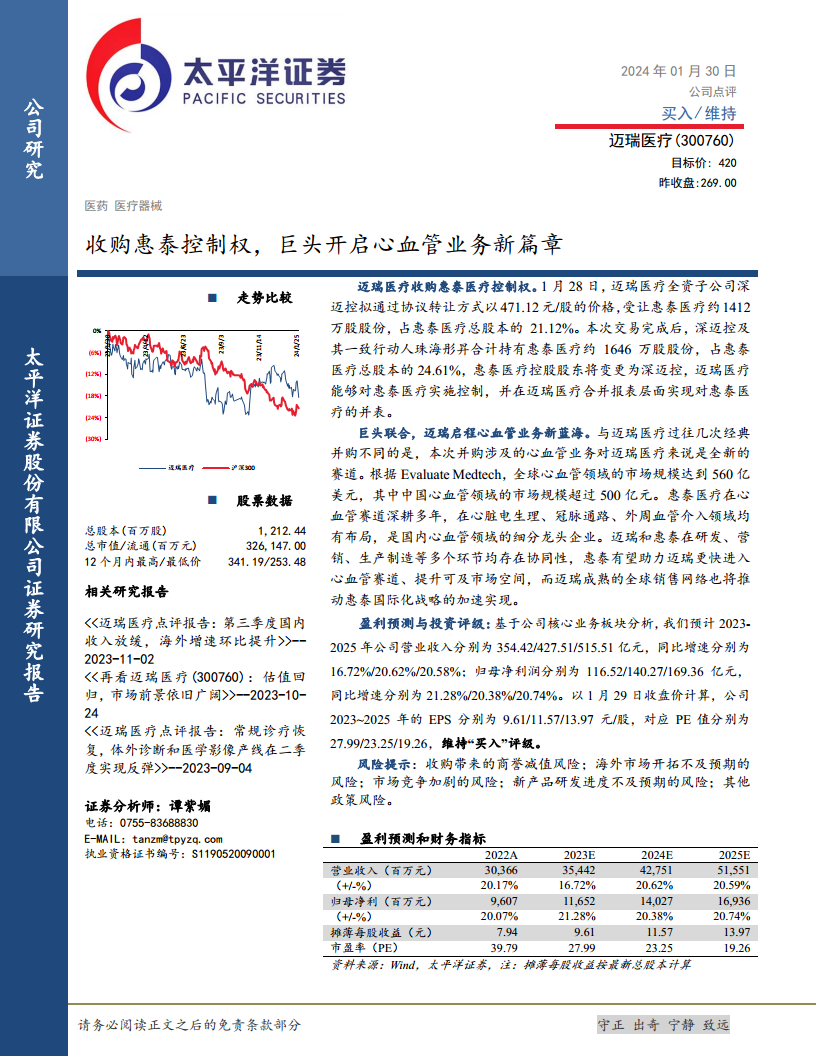 迈瑞医疗(300760):收购惠泰控制权,巨头开启心血管业务新篇章