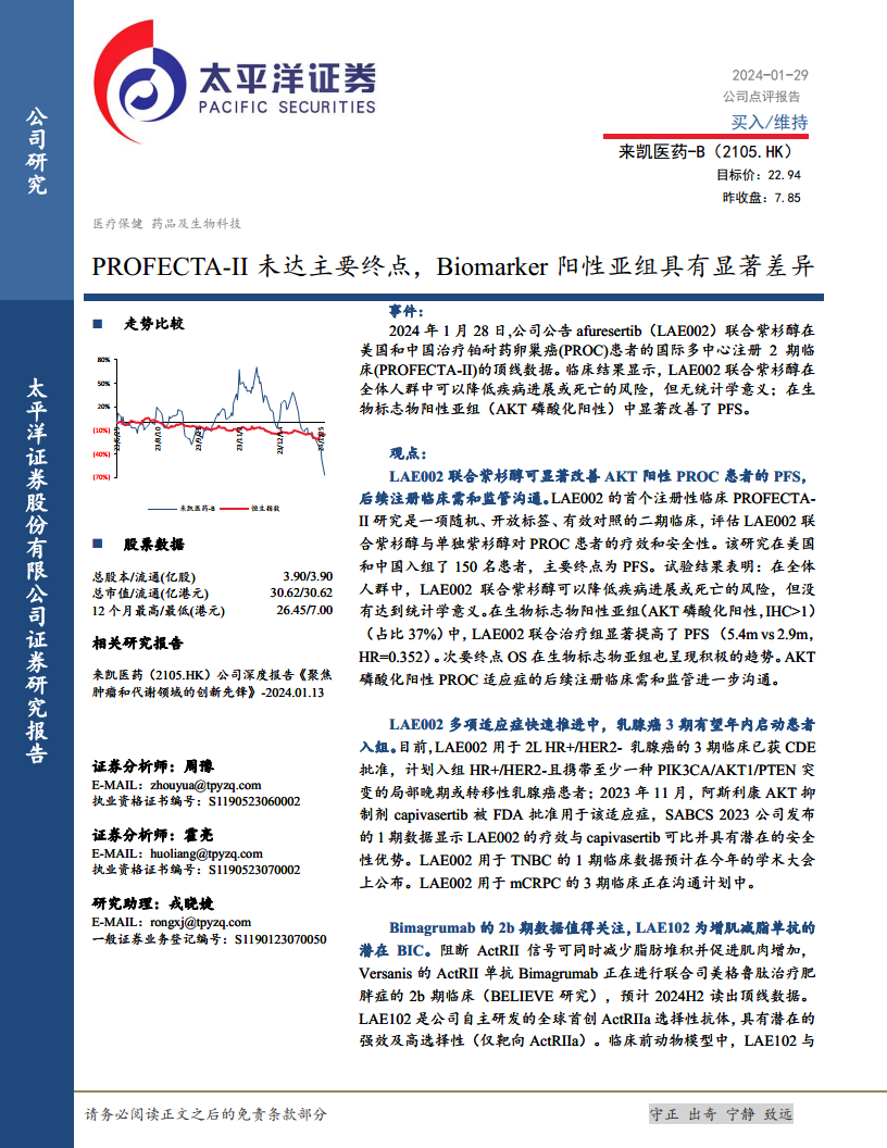 来凯医药-B(02105):PROFECTA-II未达主要终点,Biomarker阳性亚组具有显著差异
