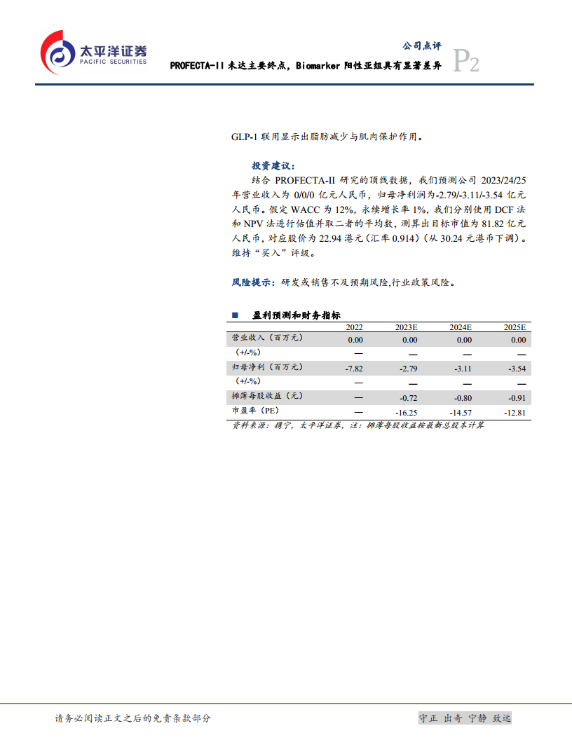 基于PROFECTA-II研究的顶线数据,分析师调整了公司未来的盈利预测,预计2023-2025年营业收入均为0,归母净利润分别为-2.79亿元、-3.11亿元和-3.54亿元人民币。通过DCF和NPV估值法,目标市值测算为81.82亿元人民币,对应目标价下调至22.94港元(原目标价为30.24港元)。尽管目标价下调,但鉴于LAE002在特定亚组的积极表现以及其他管线产品的进展,公司仍维持“买入”评级。