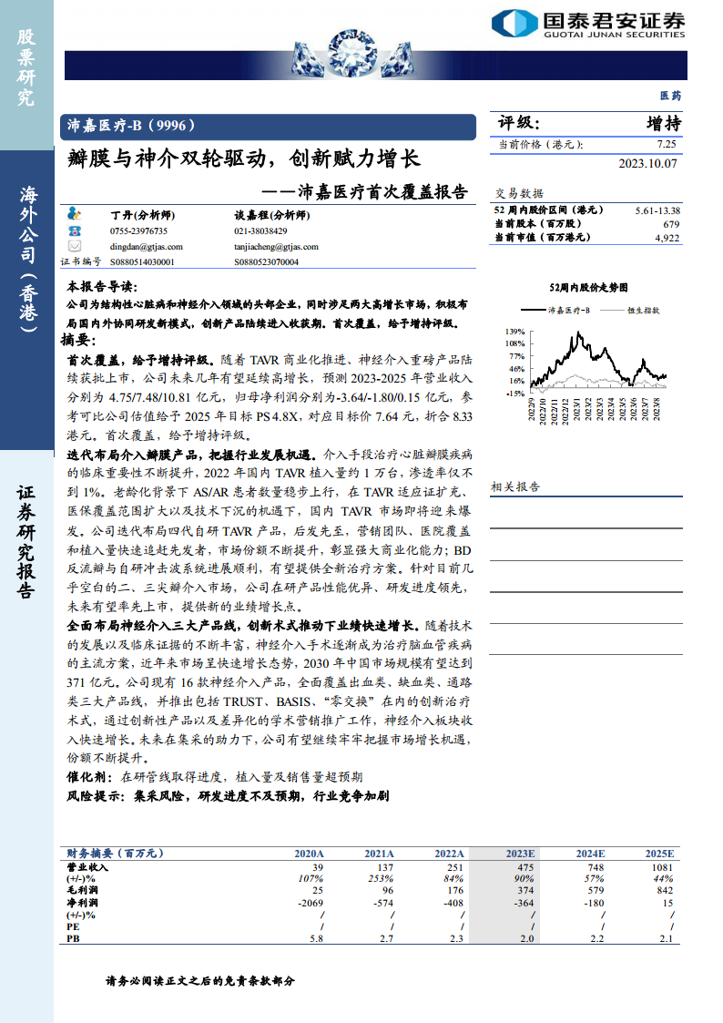 报告首次覆盖沛嘉医疗,并给予“增持”评级,主要基于公司TAVR产品商业化加速以及神经介入重磅产品陆续获批上市的预期。预计2023-2025年营业收入将分别达到4.75亿元、7.48亿元和10.81亿元,归母净利润有望在2025年实现扭亏为盈。在老龄化趋势、医保覆盖范围扩大以及国产替代加速等多重利好因素下,公司所处的两大高增长市场——瓣膜介入和神经介入——均拥有巨大的未开发潜力,为沛嘉医疗的业绩持续高增长提供了广阔空间。