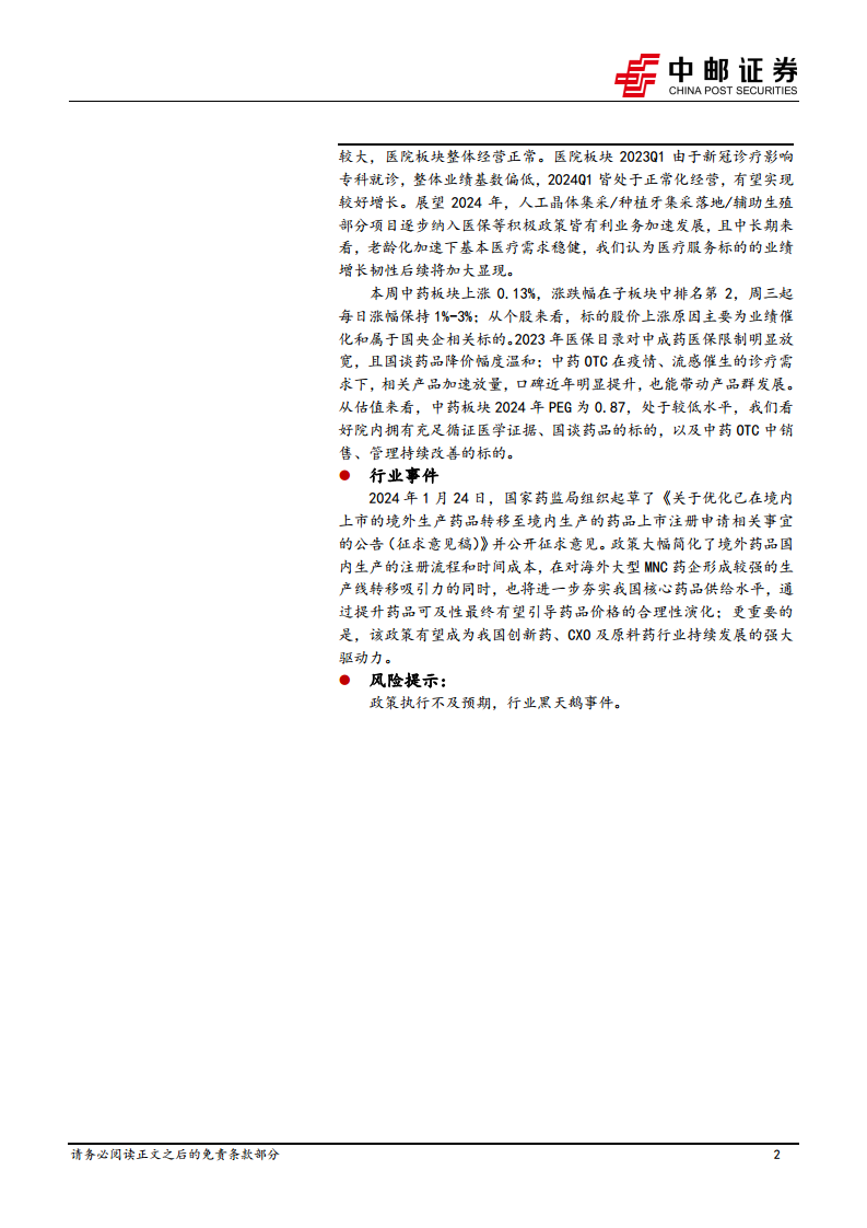 本周医药生物板块在经历初期下跌后,已呈现止跌反弹迹象,且当前行业估值处于历史低位,公募基金增持趋势明显,预示着板块存在业绩和估值修复的潜力。展望2024年,医药板块业绩有望稳中向好,投资策略应聚焦于具备“出海”能力和“刚需”属性的细分领域,如医疗设备、低值耗材、综合医疗服务和零售药店。血液制品和中药板块也因政策利好和估值优势而值得关注。国家药监局优化境外药品境内生产注册流程的政策,将为国内创新药、CXO及原料药行业带来强大驱动力。尽管2023年部分公司业绩预告显示出高基数效应和市场调整带来的压力,但整体而言,随着利空因素逐步出清和积极政策的落地,2024年医药生物行业有望迎来逐季向好的发展趋势。投资者需关注政策执行不及预期及行业黑天鹅事件等风险。