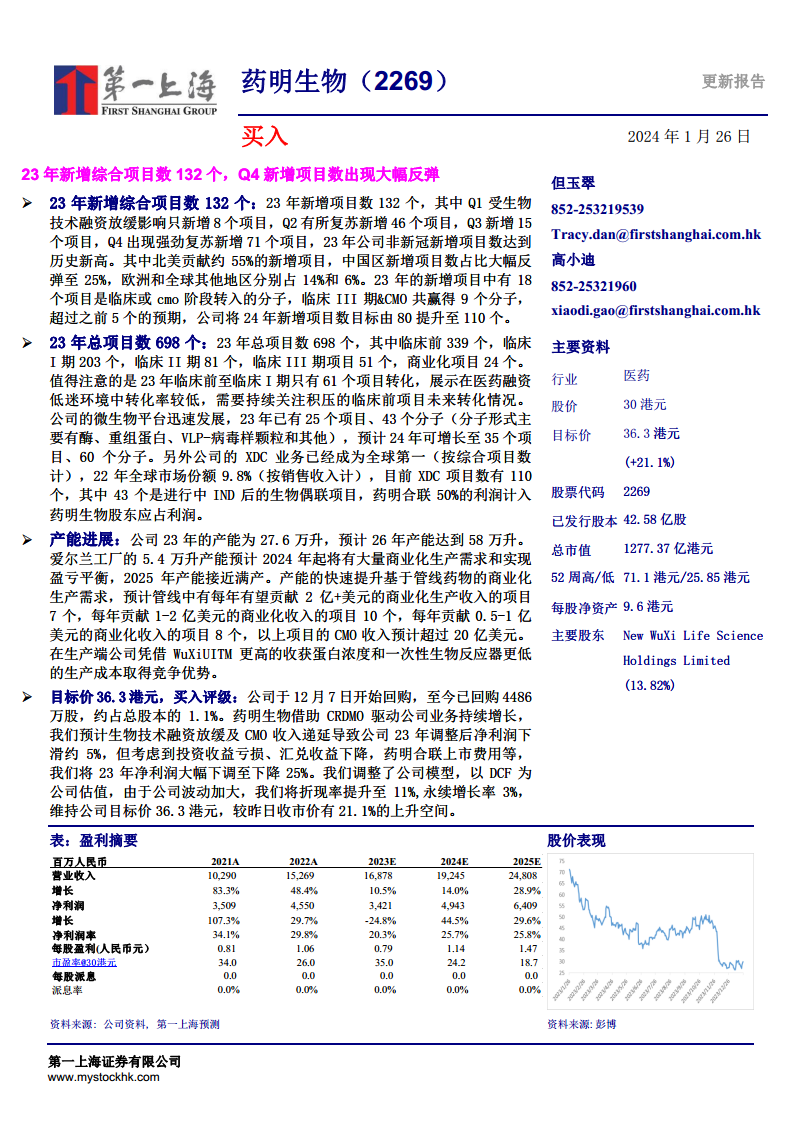 药明生物在2023年展现出强大的业务韧性,尤其在第四季度新增项目数强劲反弹,非新冠项目创历史新高。公司在微生物平台和XDC业务领域保持领先地位,并持续推进产能扩张以满足未来商业化需求。尽管2023年净利润受非经营性因素影响有所下滑,但核心业务表现稳健,且未来两年盈利增长预期强劲。基于DCF估值模型,公司目标价36.3港元,具有显著上升空间,维持“买入”评级。