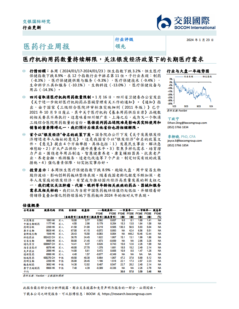 尽管近期港股医药板块整体表现承压,恒生医疗保健指数跑输大盘,但报告认为当前中国医药板块估值仍处于历史低位。随着政策利好持续落地和市场情绪修复,银发经济的崛起有望成为推动国内经济高质量发展的新支柱之一,从而为医药行业提供强劲的增长动力。因此,报告建议投资者关注与银发经济相关的长期医疗需求,以及在创新药、医疗服务和器械等细分领域的优质标的,预计2024年医药板块将有相对大市的良好表现。