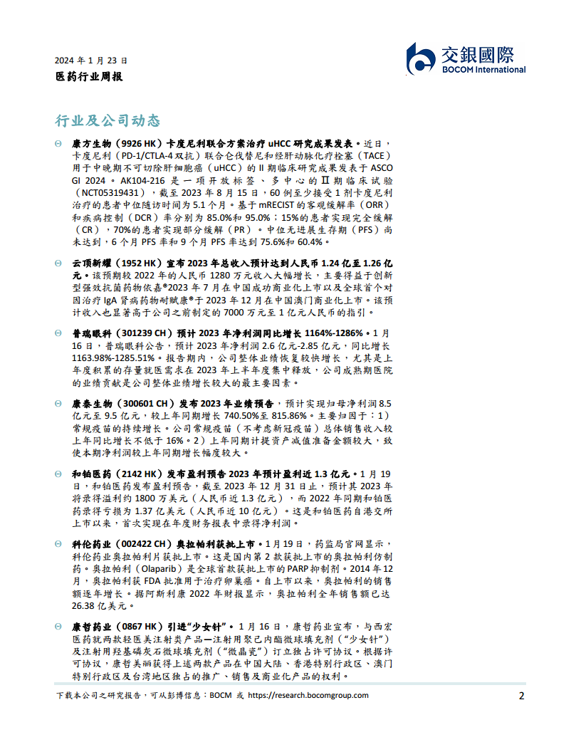本周多家医药公司发布了积极的业绩预告或产品进展:
