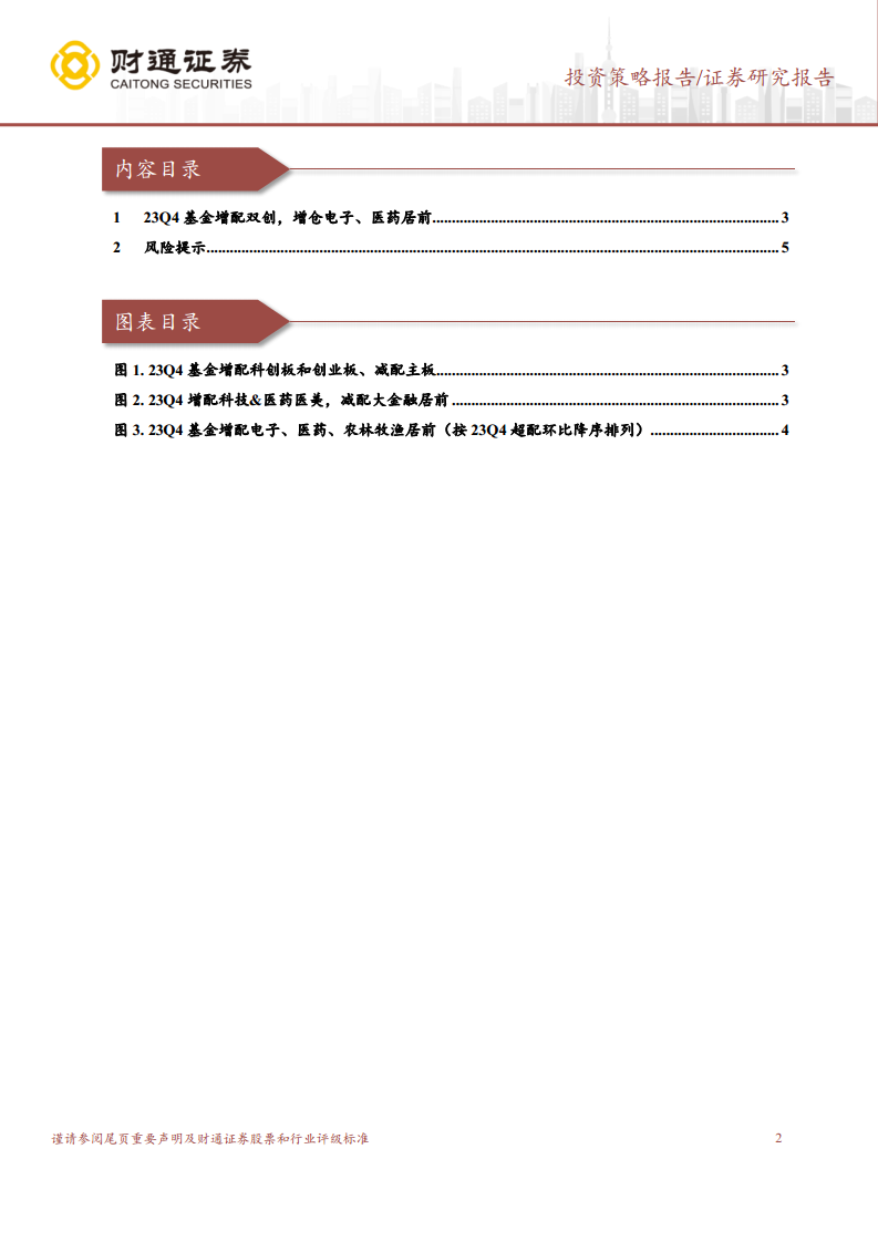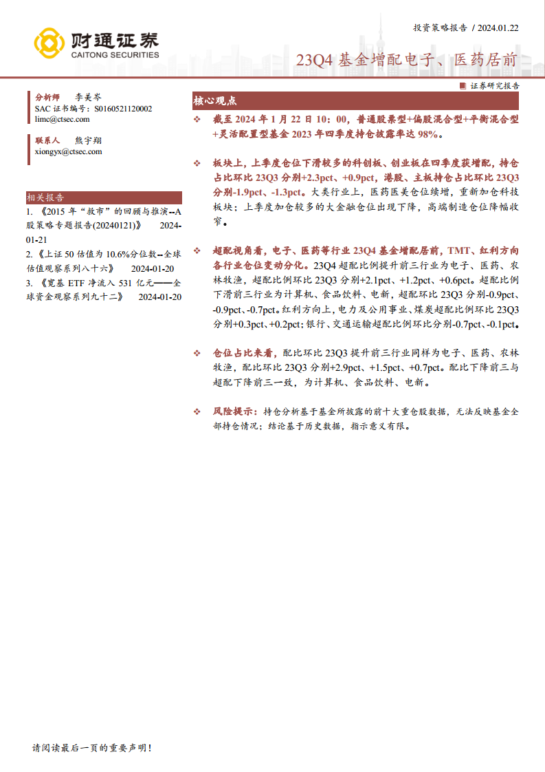 本报告深入分析了2023年第四季度普通股票型、偏股混合型、平衡混合型及灵活配置型基金的持仓情况,截至2024年1月22日,披露率已达98%。报告核心观点指出,基金在四季度进行了显著的结构性调整,主要表现为对科创板和创业板的增配,以及在行业层面,电子和医药板块获得了基金的重点增持。