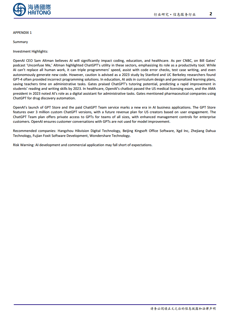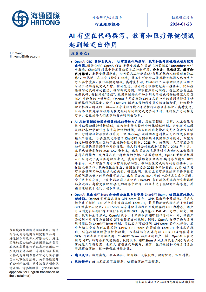 本报告核心观点指出,人工智能(AI)技术,特别是以ChatGPT为代表的生成式AI,正日益在代码撰写、教育和医疗保健等关键行业中发挥突出作用,预示着这些领域生产力的大幅提升和深远变革。OpenAI通过推出GPT Store和ChatGPT Team等创新商业服务,正加速推动AI技术的广泛落地和商业模式创新,将AIGC(人工智能生成内容)的商业化进程推向新阶段。
