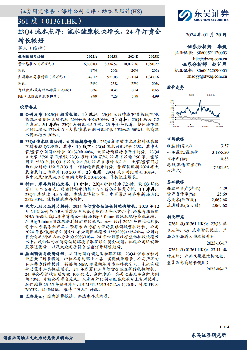 361度在2023年第四季度实现了健康的较快增长,各渠道流水表现强劲,折扣和库存状况持续改善。公司通过签约NBA球星约基奇,有效提升了品牌影响力和篮球品类增长潜力。2024年订货会数据积极,预示着公司营收将继续保持快速增长,并有望突破百亿大关。鉴于其稳健的业绩增长、持续提升的品牌力、优化的运营效率以及具有吸引力的估值和分红政策,公司具备良好的投资价值,维持“买入”评级。