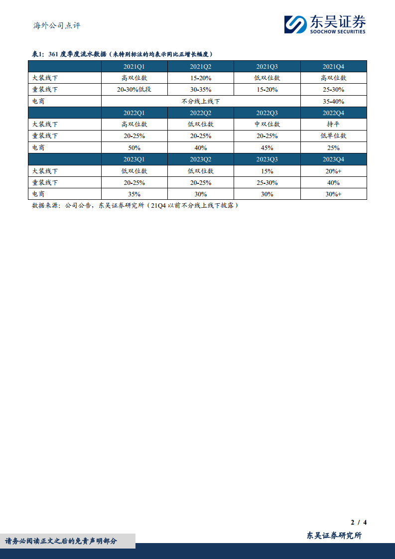 2023年第四季度,361度在相对低基数下实现了流水增长提速。主品牌线下流水同比增长约20%以上,童装线下流水同比增长约40%,电商流水同比增长超过30%。全年来看,整体线下流水同比增长约17%(大装同比增长15%以上,童装同比增长近30%),电商流水同比增长超过30%。其中,电商渠道大装和童装流水分别同比增长30%和55%,保持快速增长势头。