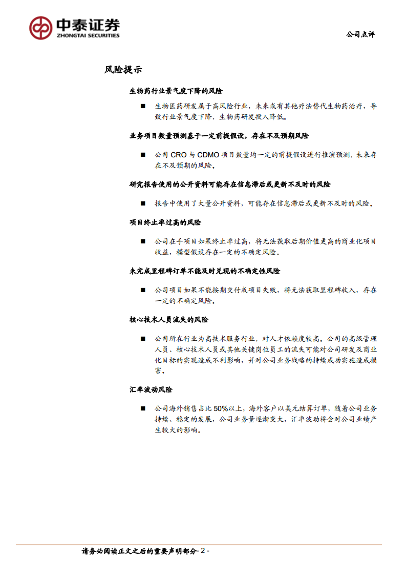 药明生物在2023年新签项目数量上表现出色,尤其在下半年实现了强劲的业务复苏,非新冠项目数创历史新高,并上调了2024年新增项目目标,显示出公司业务逐步恢复的积极态势。尽管全球投融资波动、新冠订单减少以及产能扩张带来的折旧摊销增加导致短期盈利预测有所调整,但公司在XDC、疫苗和双抗等先进技术平台上的持续投入和进展,有望为未来带来新的增长动能。鉴于公司在全球生物药外包服务领域的稀缺地位和显著优势,以及未来项目商业化和平台技术兑现的潜力,中泰证券维持其“买入”评级。同时,报告也提示了生物药行业景气度下降、项目数量不及预期、核心技术人员流失以及汇率波动等潜在风险。
