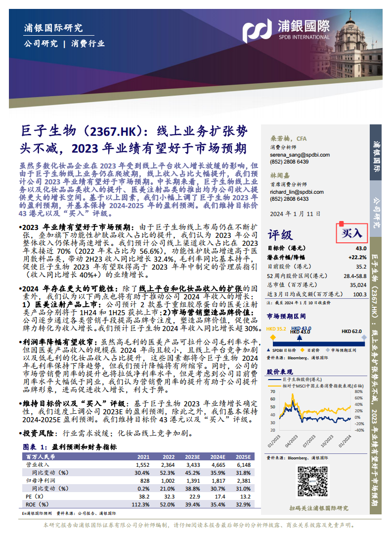 巨子生物凭借其线上业务的强劲扩张和功能性护肤品的优异表现,预计2023年业绩将超市场预期,实现收入和净利润的高速增长。展望2024年及中长期,公司通过医美注射新品的推出和持续的品牌营销投入,将进一步拓宽增长空间。尽管短期内利润率可能面临结构性调整,但其积极的战略布局和巨大的市场潜力支持其长期增长前景。浦银国际维持巨子生物“买入”评级,目标价43港元。
