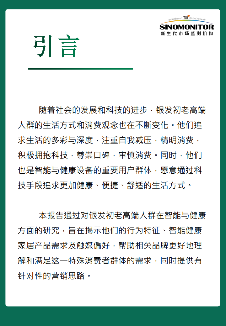 本报告通过对CMMS-Premium 2023年数据的深入分析,全面揭示了中国银发初老高端人群在智能与健康设备领域的消费趋势和行为特征。该群体不仅拥有显著的财富实力和消费潜力,而且积极拥抱科技,注重生活品质与健康投入。他们对智能手表、智能家居、空气净化器、除尘电器和净水器等产品表现出高保有率和预购意愿,尤其偏好具备适老化创新、便捷性、智能化和互联互通功能的产品。在品牌选择上,国内外知名品牌均有市场,但消费者更看重产品的质量、可靠性及技术创新。在营销沟通方面,短视频平台是重要的曝光渠道,而电视和杂志在说服和决策过程中仍具有强大影响力。购买渠道则呈现线上线下多元化特点,家电大卖场、数码大卖场和品牌专卖店是主要选择。因此,品牌应针对该群体的独特需求和偏好,制定精准的营销策略,结合产品创新、多渠道触达和整合营销,以有效把握这一高价值市场机遇。