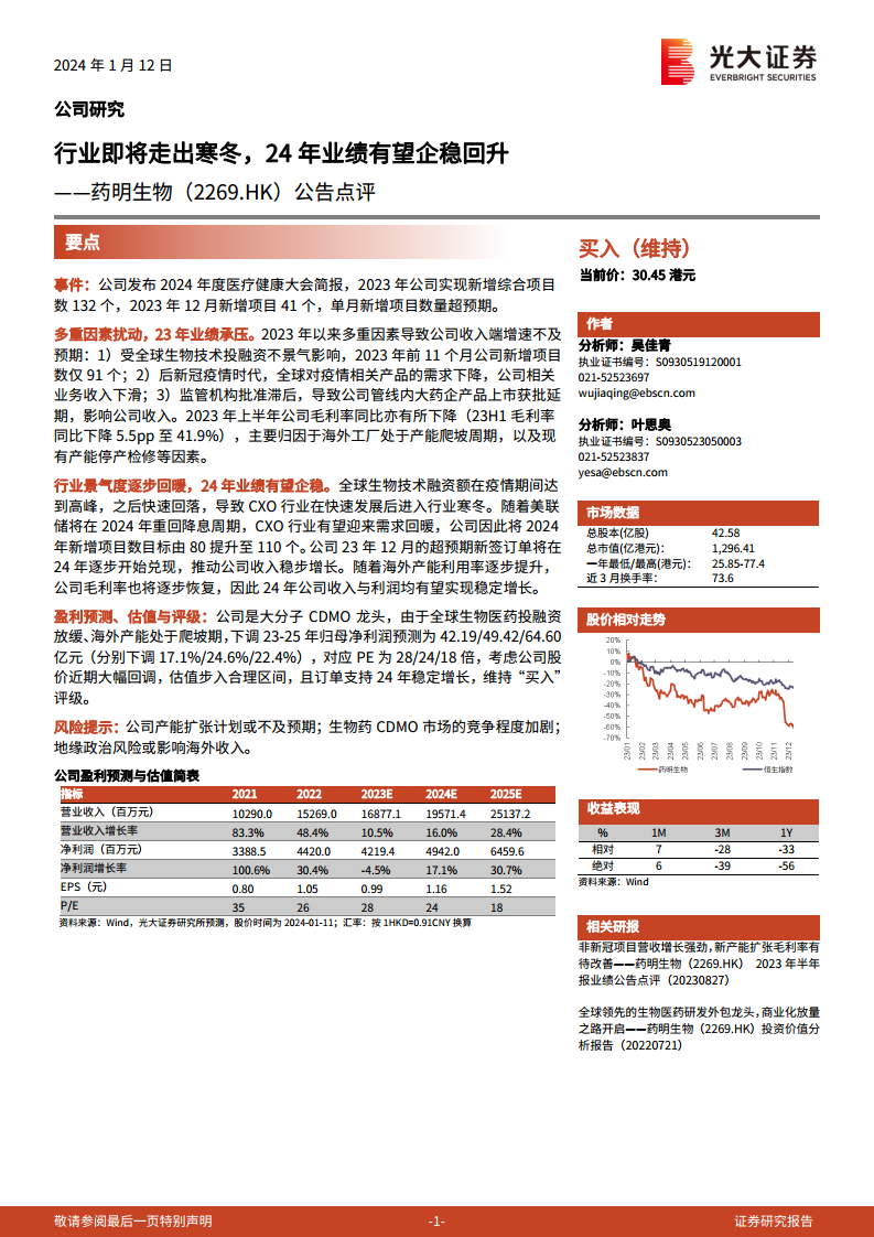 药明生物(02269)公告点评:行业即将走出寒冬,24年业绩有望企稳回升