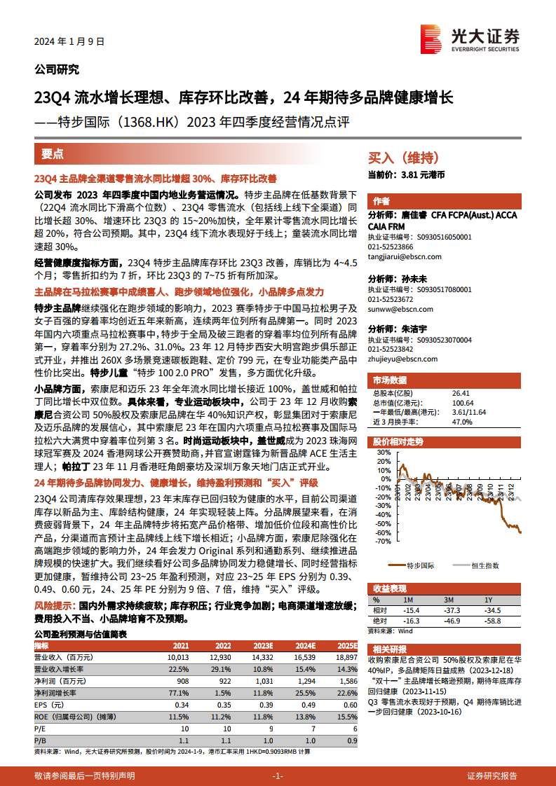 特步国际在2023年第四季度展现出强劲的经营韧性,主品牌零售流水实现超30%的同比高增长,全年累计增长超20%,同时库存结构得到显著优化,库销比回归健康区间。公司通过持续强化特步主品牌在跑步领域的专业地位,并成功推动索康尼、迈乐、盖世威、帕拉丁等小品牌实现高速增长和市场拓展,多品牌矩阵效应日益凸显。展望2024年,特步国际将以健康的库存水平和清晰的多品牌协同发展战略,应对市场挑战,主品牌将拓宽产品价格带以适应市场需求,小品牌则继续深耕细分市场,预计将实现稳健的业绩增长。基于对公司多品牌战略和经营健康度的积极预期,分析师维持了对特步国际的“买入”评级及未来三年的盈利预测。