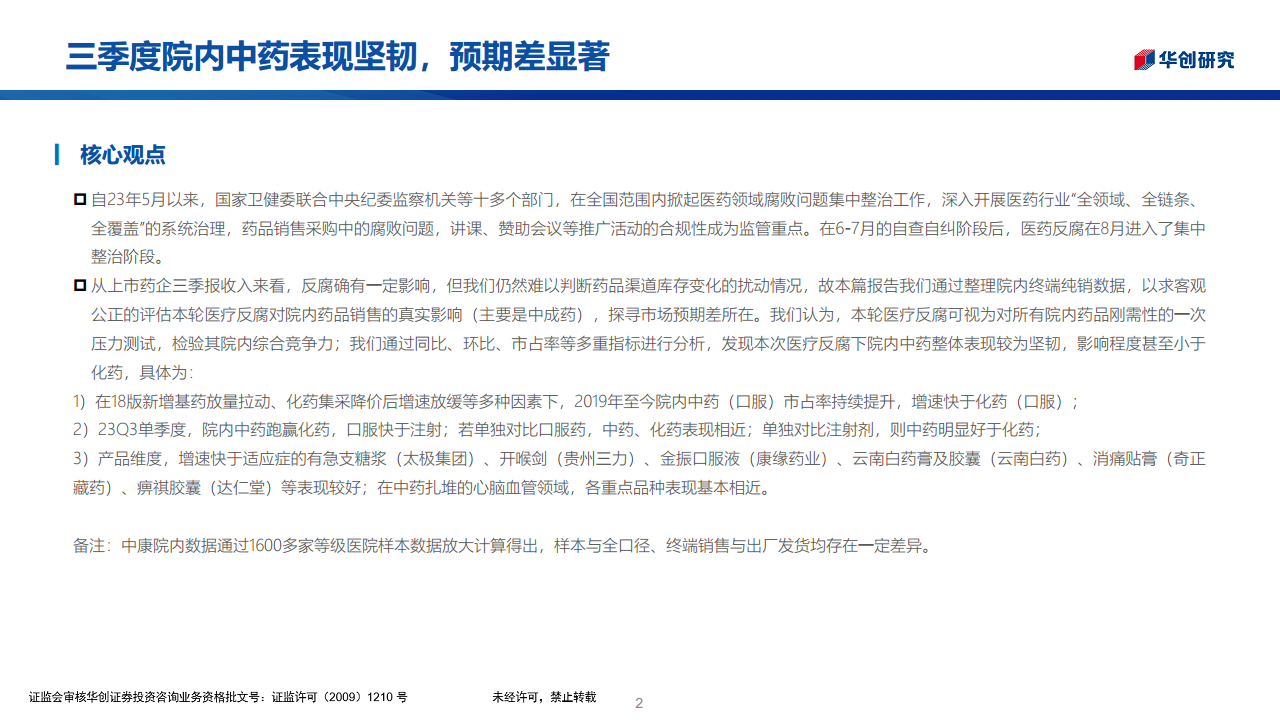 23年3季度中药院内纯销数据分析:医疗反腐压力测试下,院内中药表现坚韧