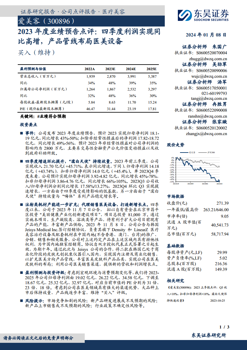 爱美客在2023年实现了显著的业绩增长,尤其第四季度利润同比高增,主要得益于核心产品“濡白天使”和“嗨体”系列的强劲表现。公司积极通过投资扩充注射类耗材产能,并战略性地引入韩国医美设备,拓展产品管线,为未来增长奠定基础。尽管分析师对未来几年的盈利预测进行了小幅调整,但基于公司强大的市场渠道优势和持续创新的产品策略,其在医美行业的领先地位和长期增长潜力依然稳固,因此维持“买入”评级。投资者需关注市场竞争、新产品研发及政策变化等潜在风险。