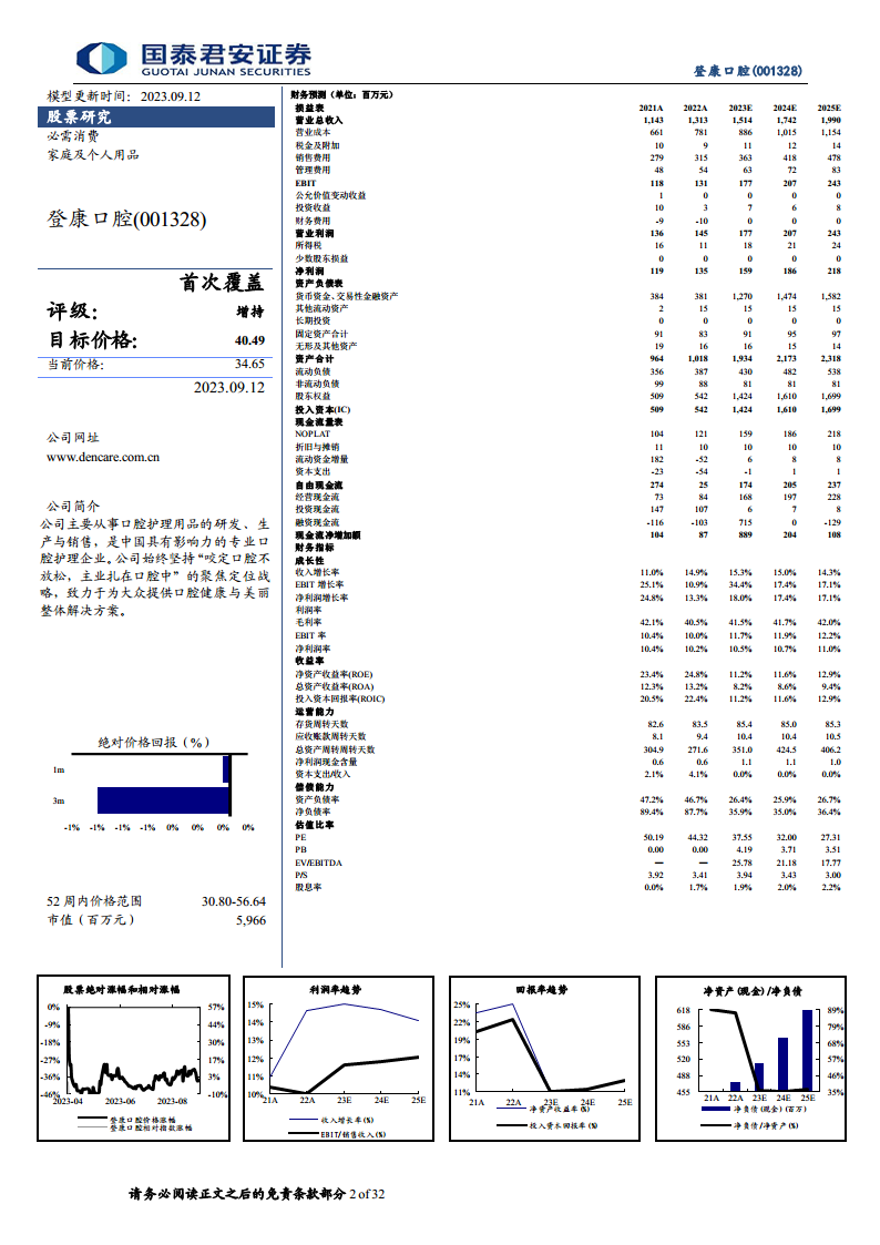 - 投资评级与目标价: 报告首次覆盖登康口腔,给予“增持”评级,目标价40.49元,对应2023年PE 44x,综合PE和PS两种分析方法取平均值,给予公司合理估值69.65亿元。