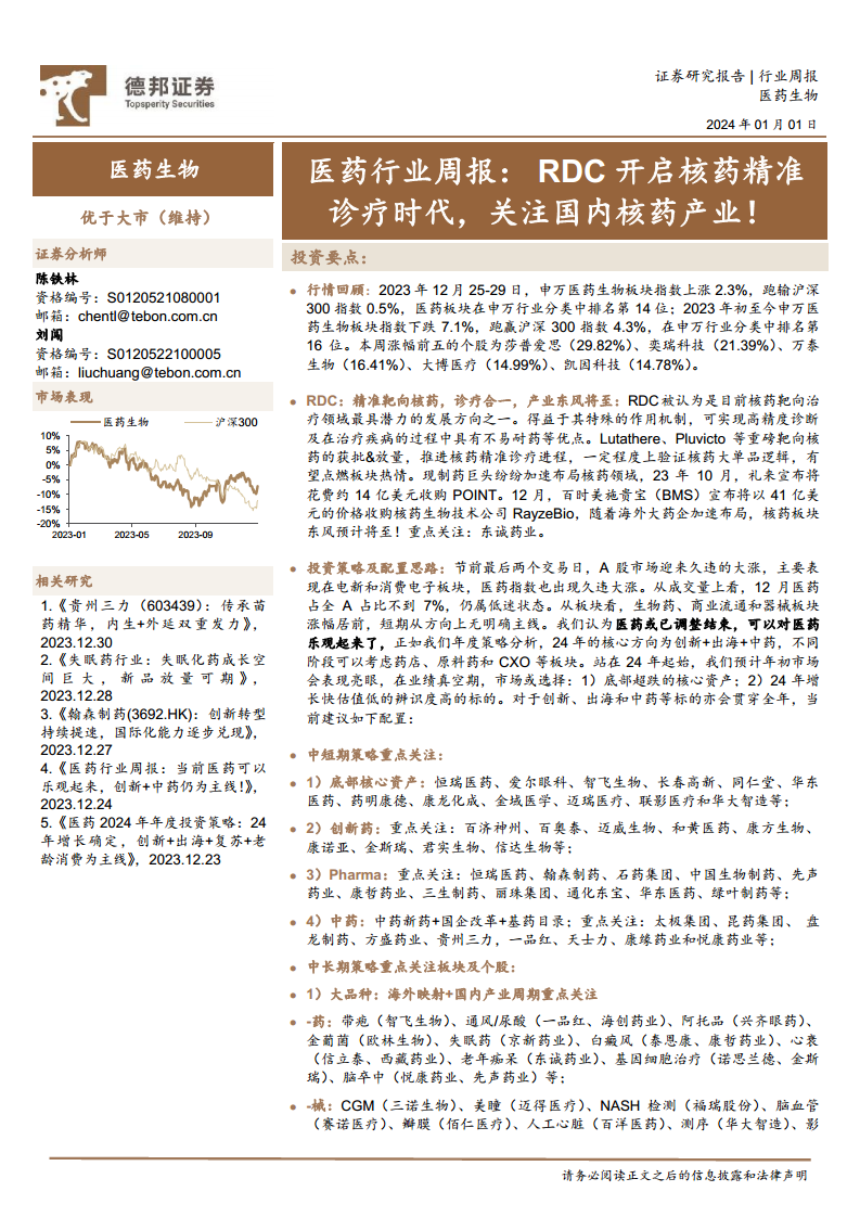 本报告深入分析了医药生物行业的最新动态与未来趋势,强调了RDC核药在精准诊疗领域的巨大潜力。RDC凭借其诊疗合一、不易耐药的优势,正吸引全球医药巨头加速布局,预示着该领域将迎来爆发式增长。同时,报告指出医药板块在经历调整后已显现触底反弹迹象,2024年投资主线将聚焦于创新、出海和中药。投资者应密切关注底部核心资产、高增长低估值标的,并对创新药、中药、CXO、生物制品和医疗器械等细分领域进行中长期战略配置。尽管市场前景乐观,但仍需警惕行业需求不及预期、上市公司业绩波动以及市场竞争加剧等潜在风险。
