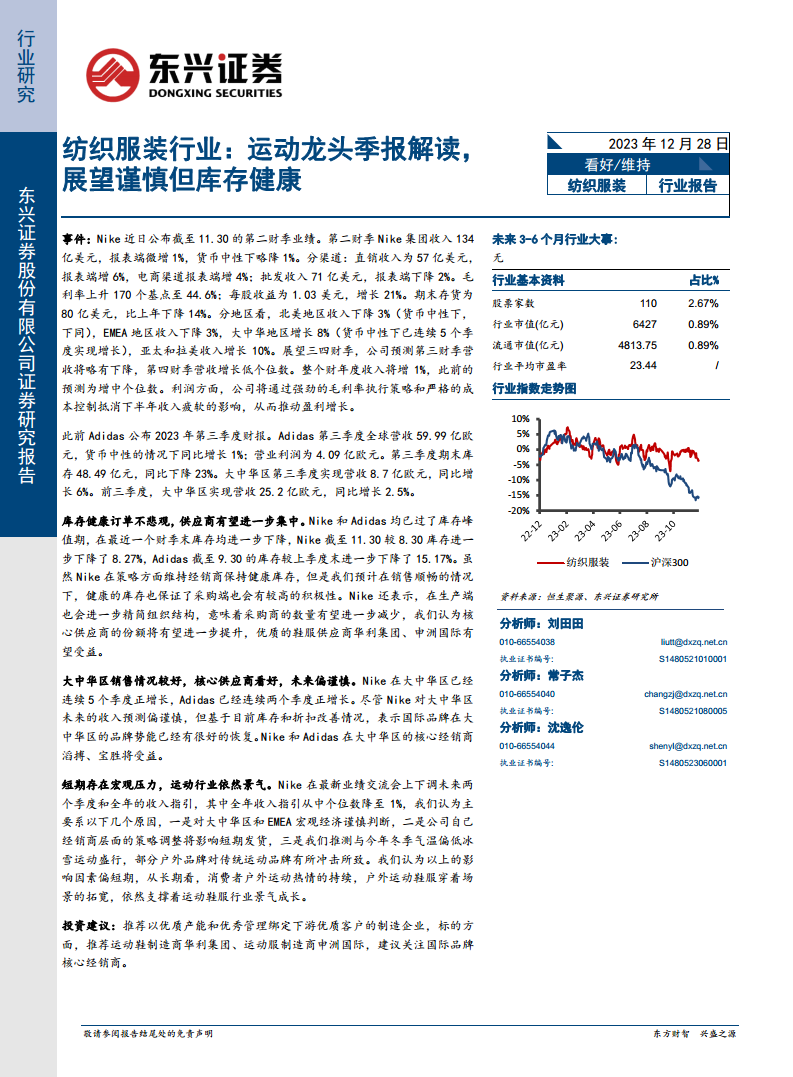纺织服装行业:运动龙头季报解读,展望谨慎但库存健康