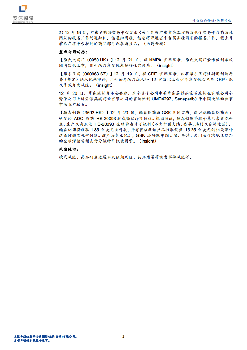 本报告对医药行业进行了专业而深入的分析,指出尽管近期港股医药板块面临回调压力,但基于创新药、医疗器械、医疗服务及中药、CXO和医美等细分赛道的强劲增长潜力,以及政策支持和企业创新活力的持续释放,2024年医药行业整体发展前景依然乐观。投资者应关注具备核心竞争力和良好成长性的优质企业,同时警惕政策风险、药品研发进展不及预期风险以及药品质量等突发事件风险。