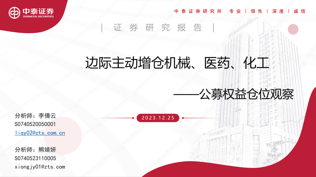 本报告的核心主题是对公募基金在权益市场的仓位配置进行深度观察与分析,特别聚焦于其在机械、医药和化工三大行业的边际主动增仓行为。这一研究旨在揭示市场资金的最新流向,以及专业机构投资者对特定行业未来表现的预期与策略调整。
