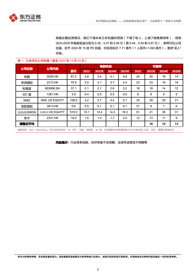 尽管盈利预测有所下调,但报告仍维持对特步国际的“买入”评级,并基于2024年15倍PE估值,设定目标价为7.71港元,预期主品牌在库存逐步清理后有望恢复健康增长。投资者在关注新品牌增长潜力的同时,也需警惕行业竞争加剧、经济恢复不及预期以及去库存进度低于预期等风险因素。